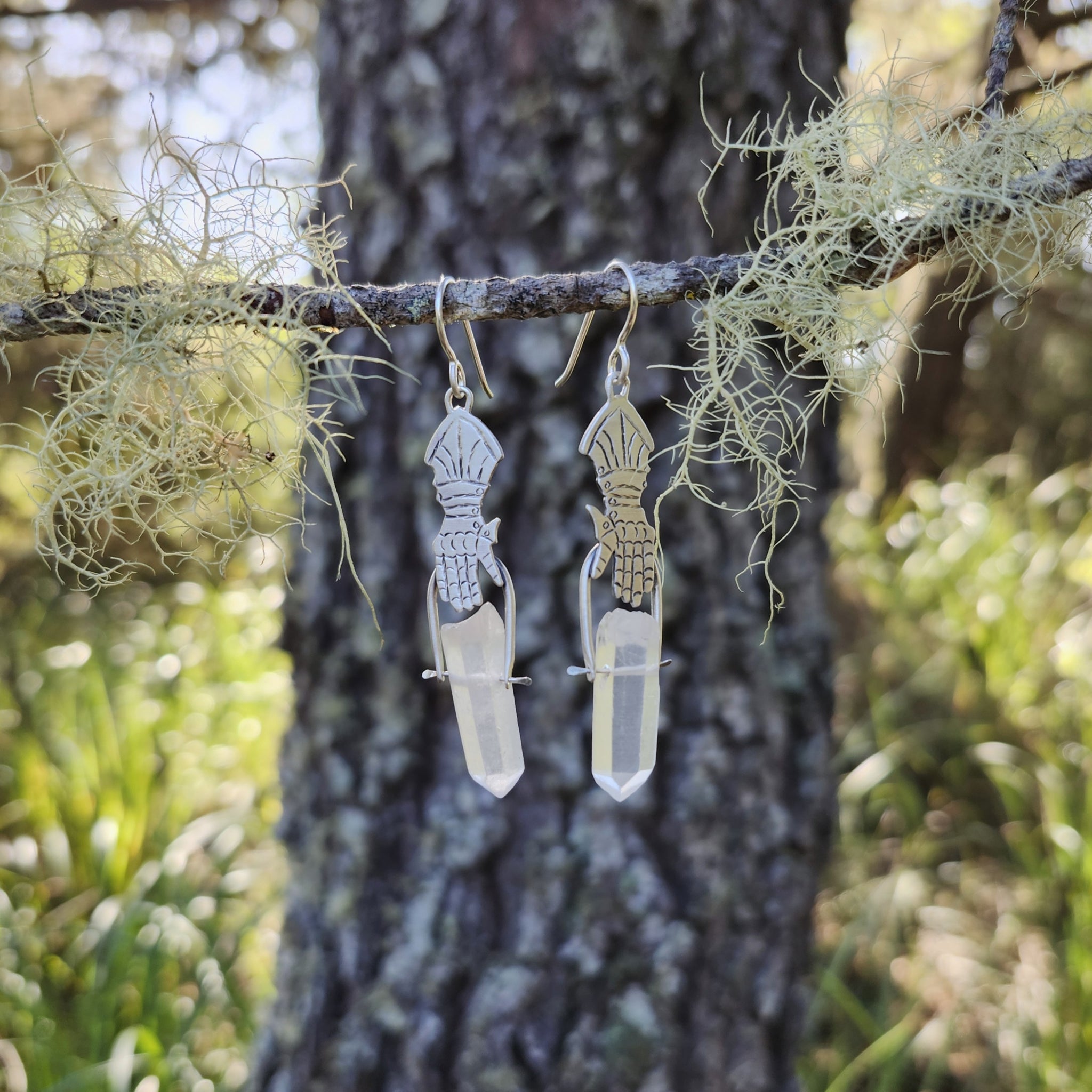 Strong and sassy, and just a little bit magical, these earrings are looking for a wearer to match! Natural quartz point crystals dangle from medieval inspired armored gauntlets.