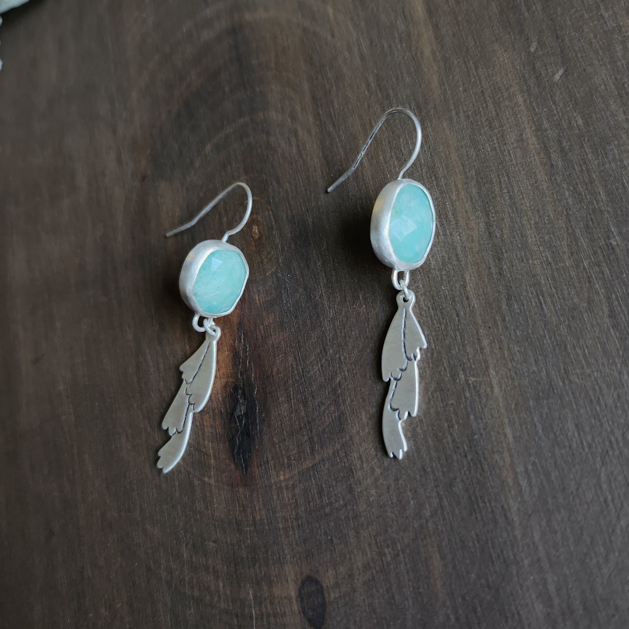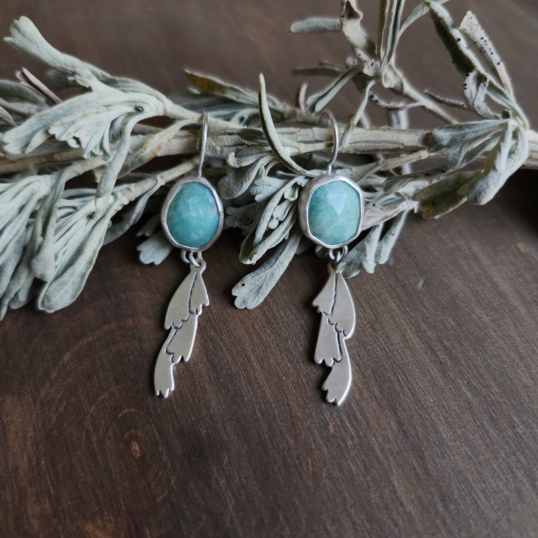 Hand pierced and stamped sagebrush sprigs dangle below bright, faceted, turquoise-colored amazonite, set securely in silver bezels.