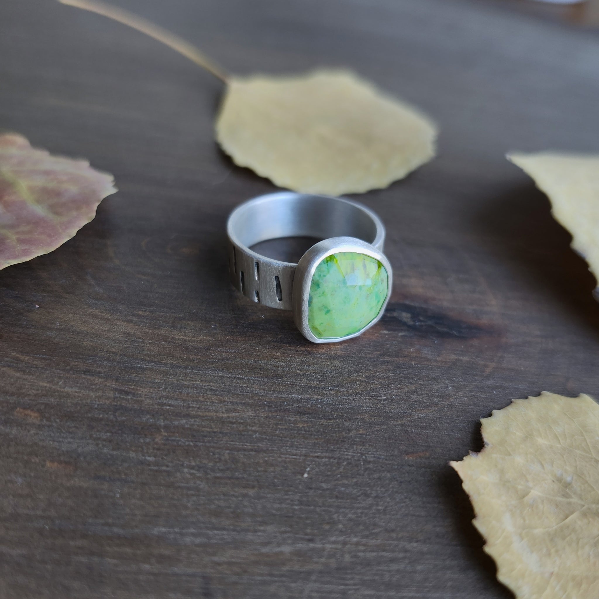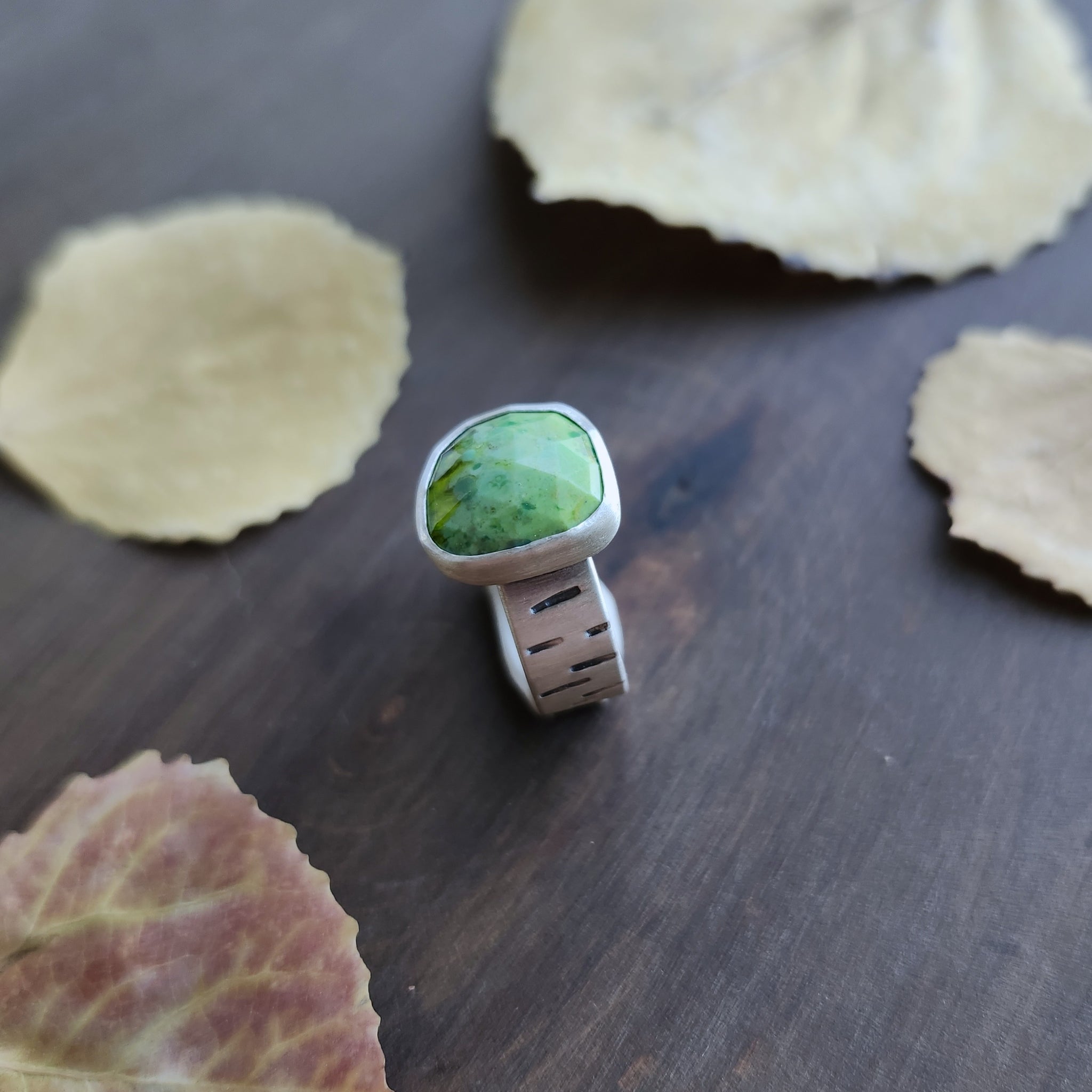 A silver band patterned with a texture reminiscent of birch or aspen trees, and topped with a bright green faceted Brazilian turquoise stone set in a simple bezel.
