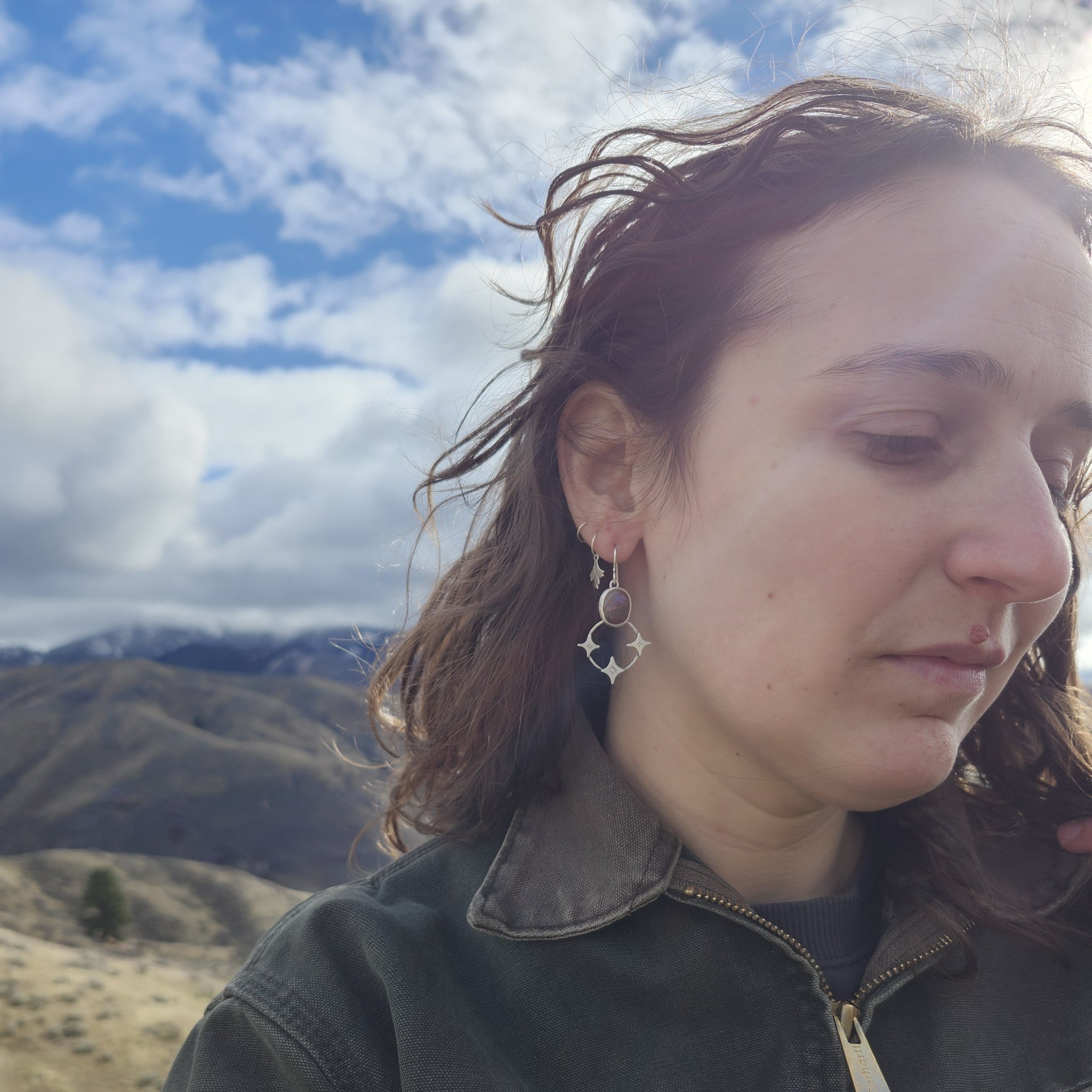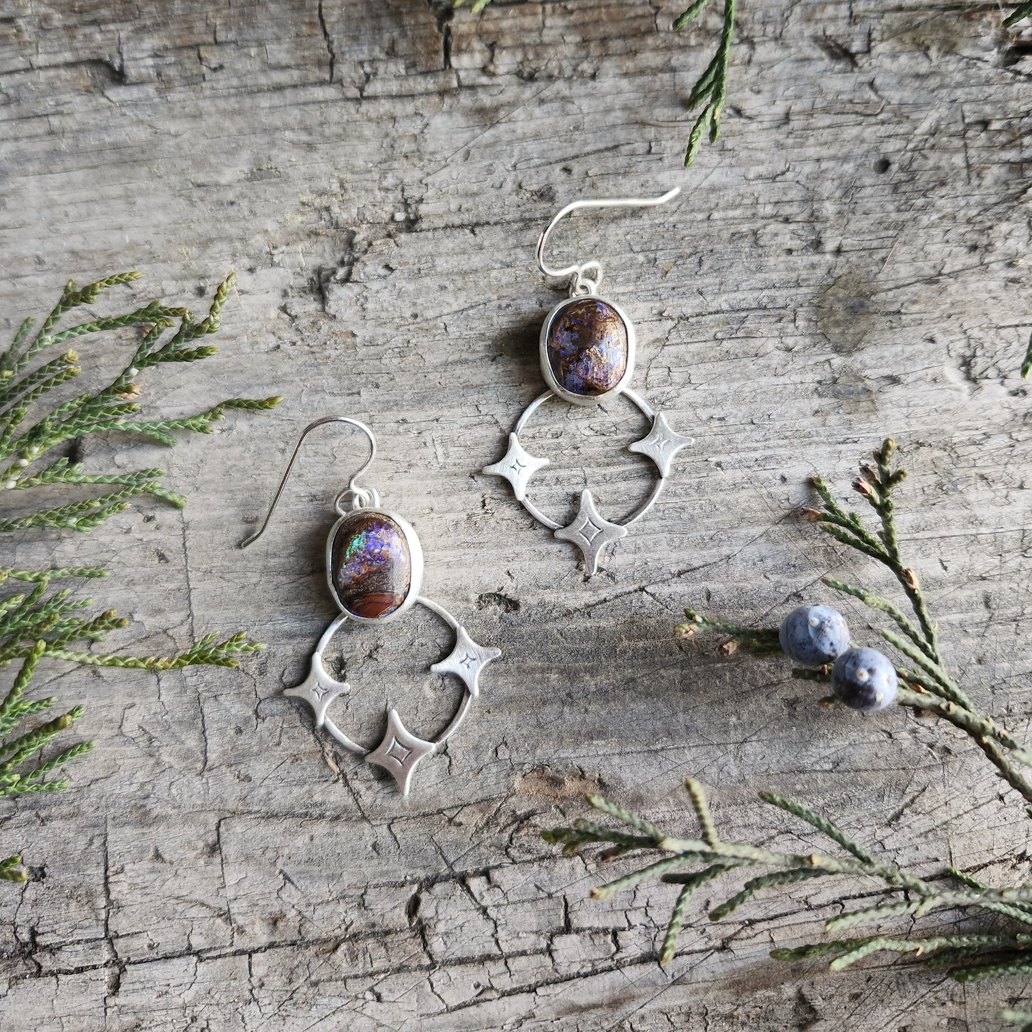 These earrings feature boulder opal cabs with stunning blue, purple, and green flash, with silver wire hoops studded with hand pierced four pointed stars hanging below.