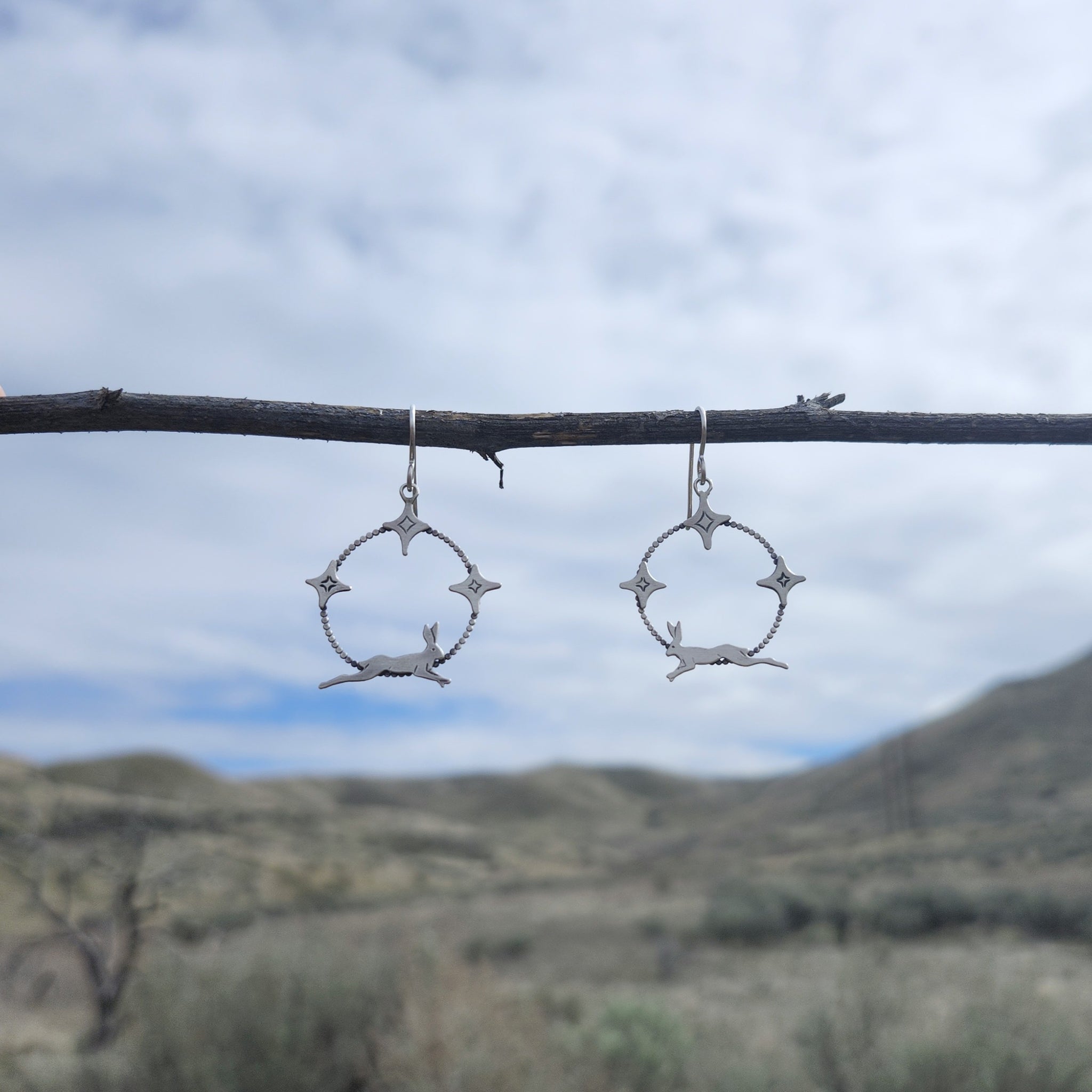 Rabbits dance beneath a sky of stars. These earrings feature beaded silver wire hoops studded with hand pierced four pointed stars and running jack rabbits, all hanging from silver ear wires. The earrings measure about 1 inch in diameter.