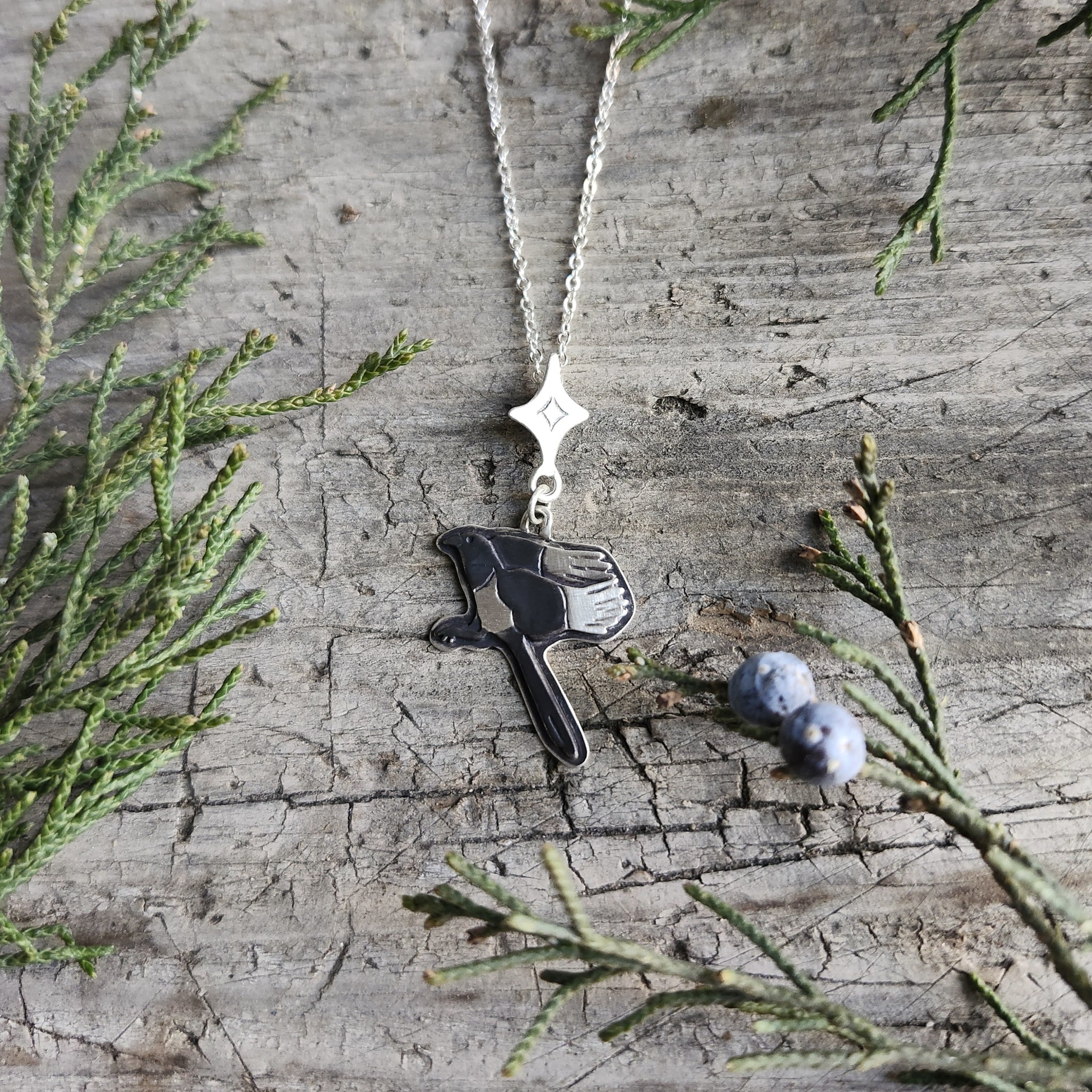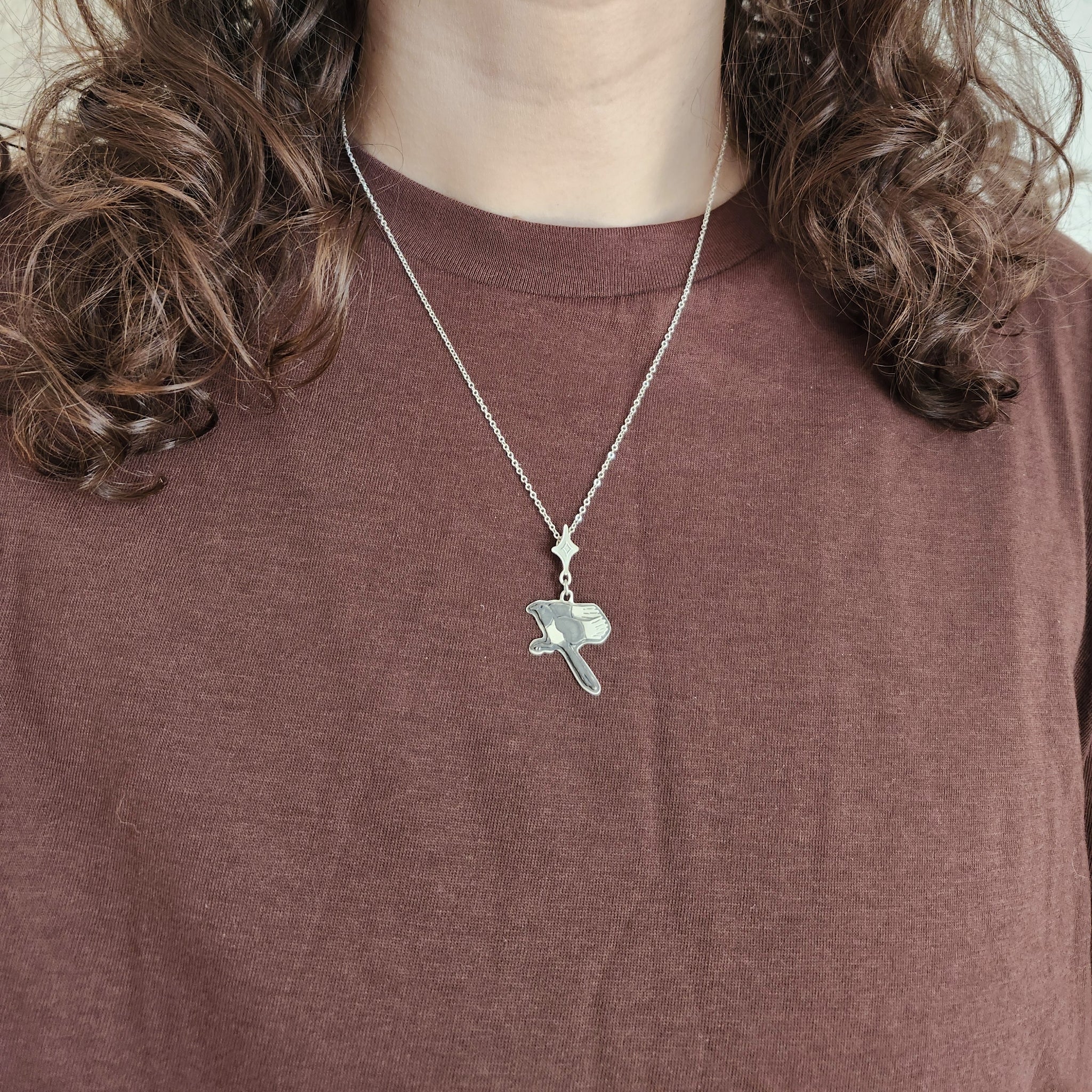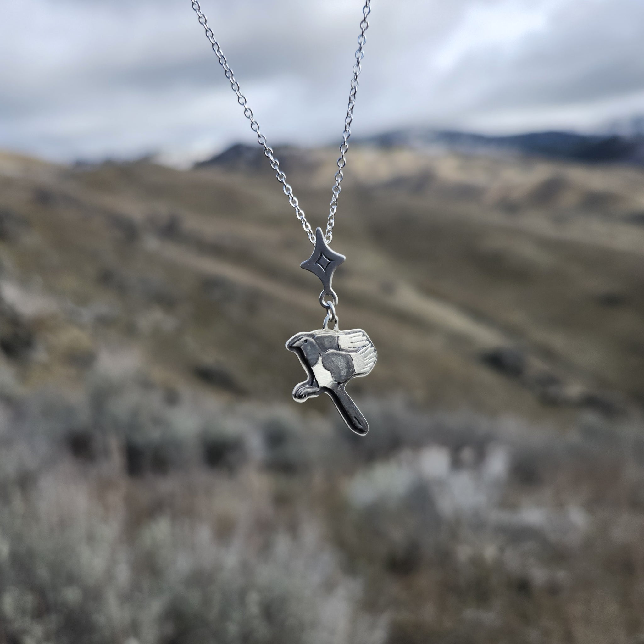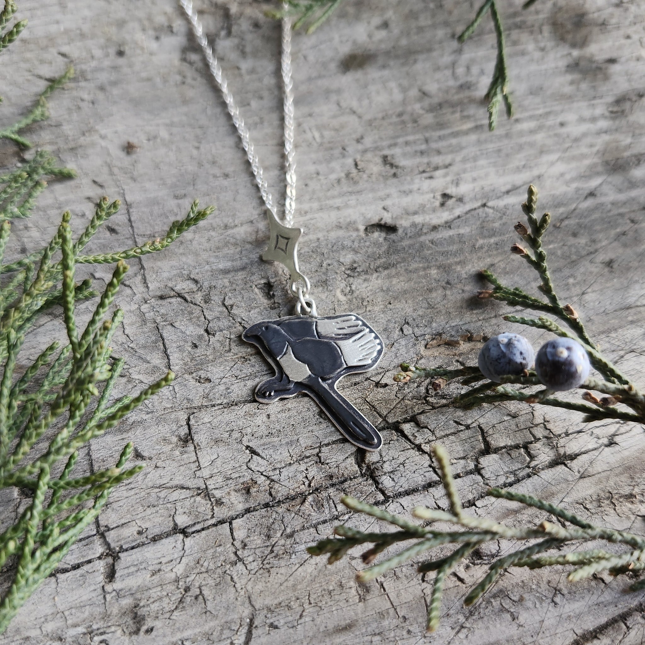 A magpie flies beneath a four pointed star. Hand pierced and stamped from three layers of silver sheet, and selectively darkened with a patina to mimic the natural black and white pattern of a magpie.