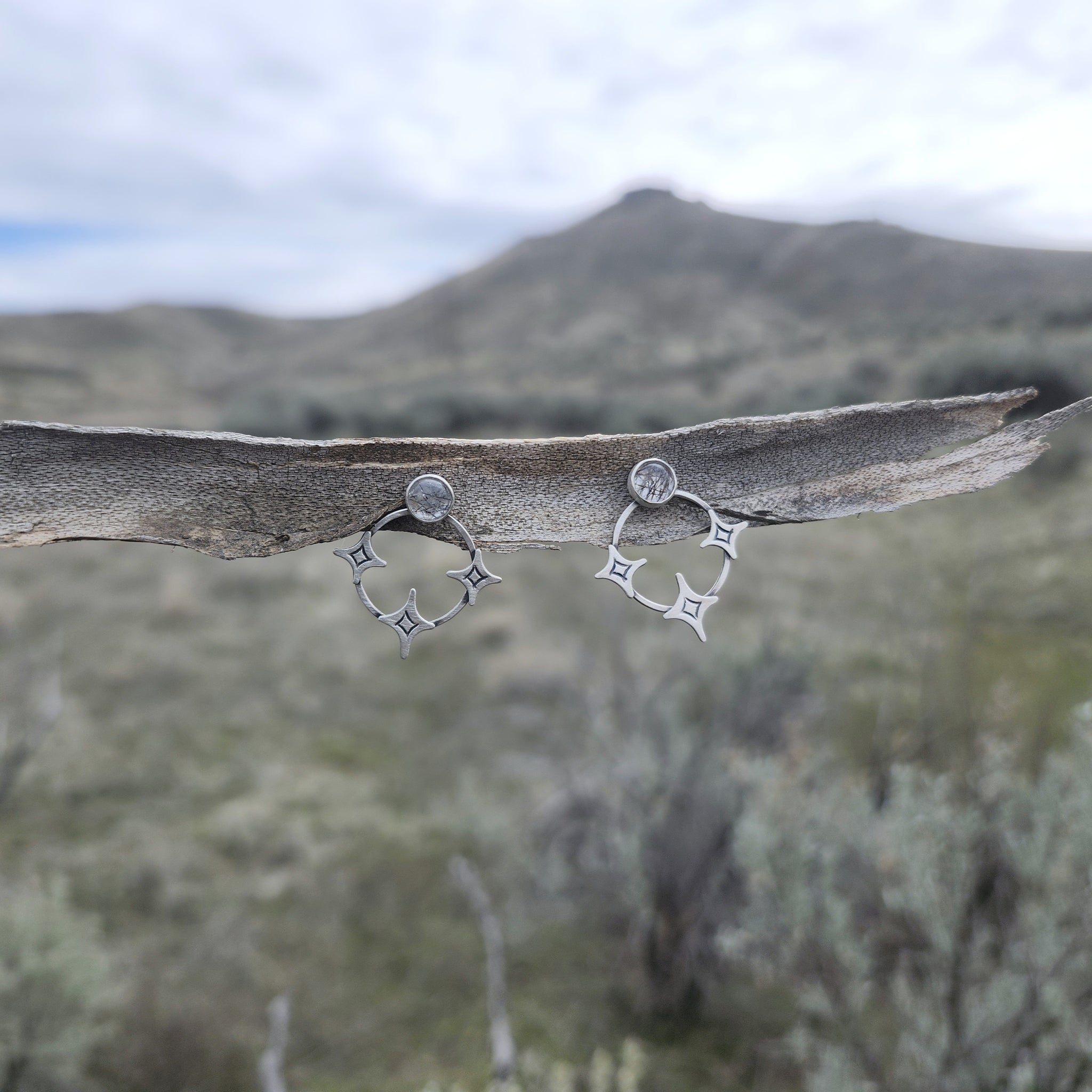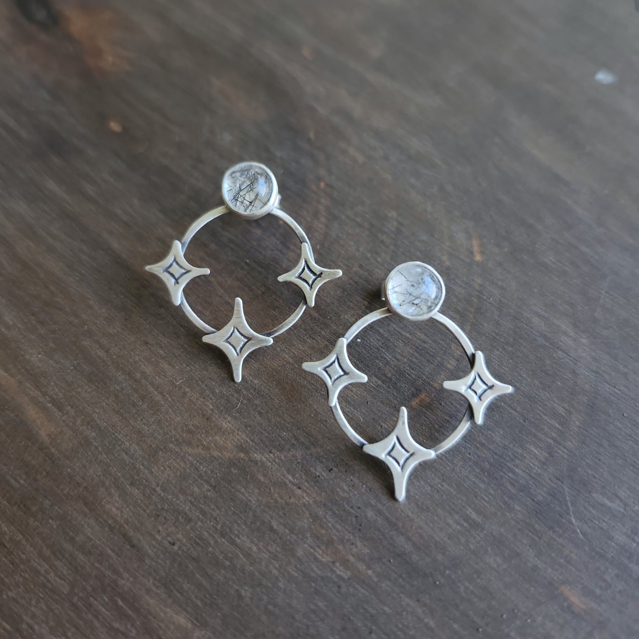 Dazzling clear quartz cabochons with tiny black rutile needles sit above a circle of stars. These glittering studs have silver ear posts and backs, and measure about one inch in diameter.