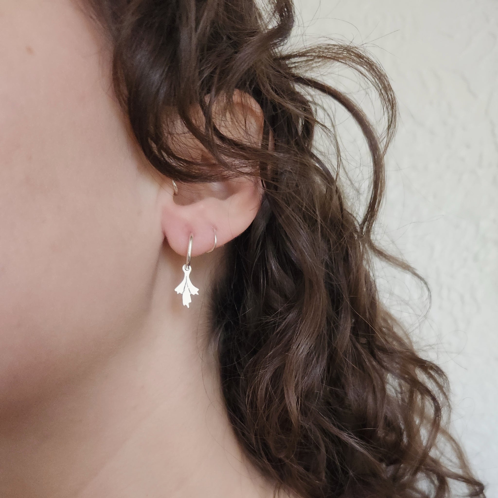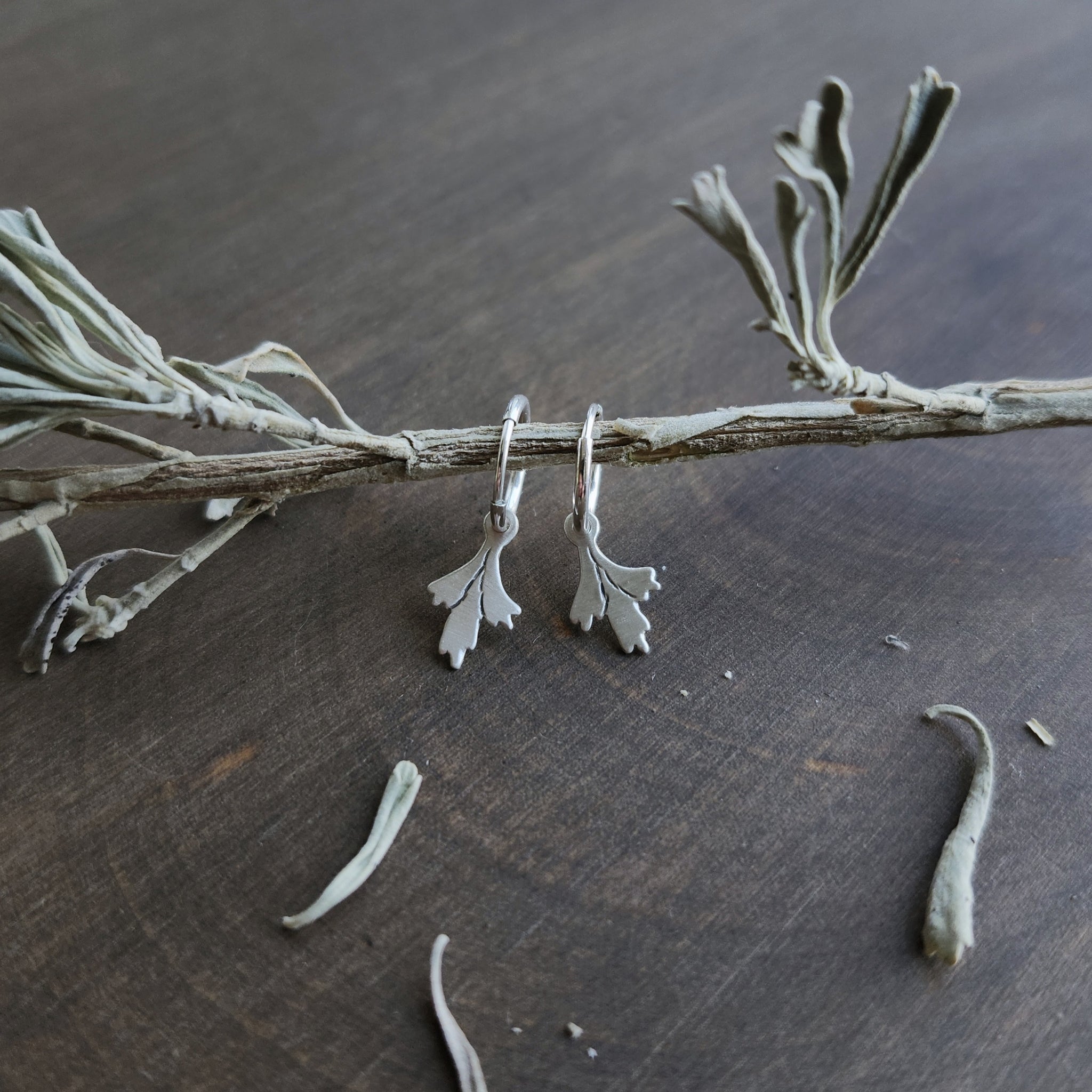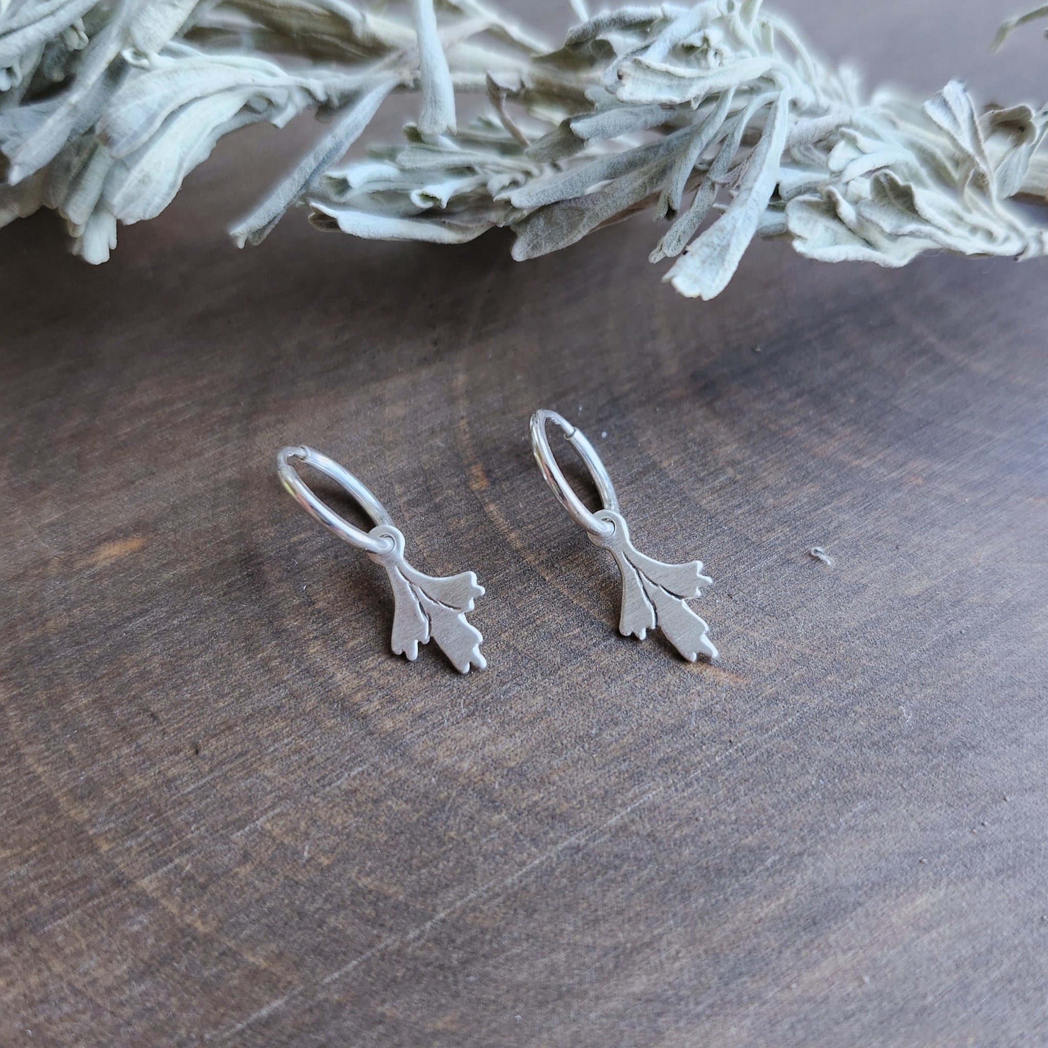 Tiny sagebrush sprigs with hand stamped details hang from sterling silver hoops.