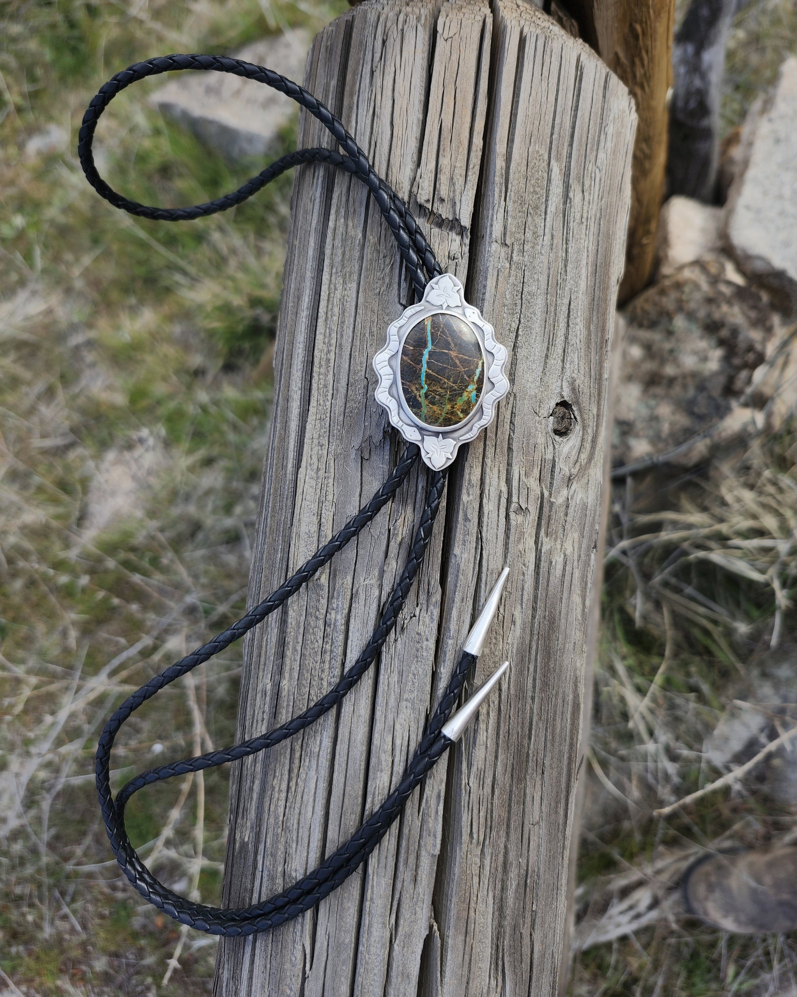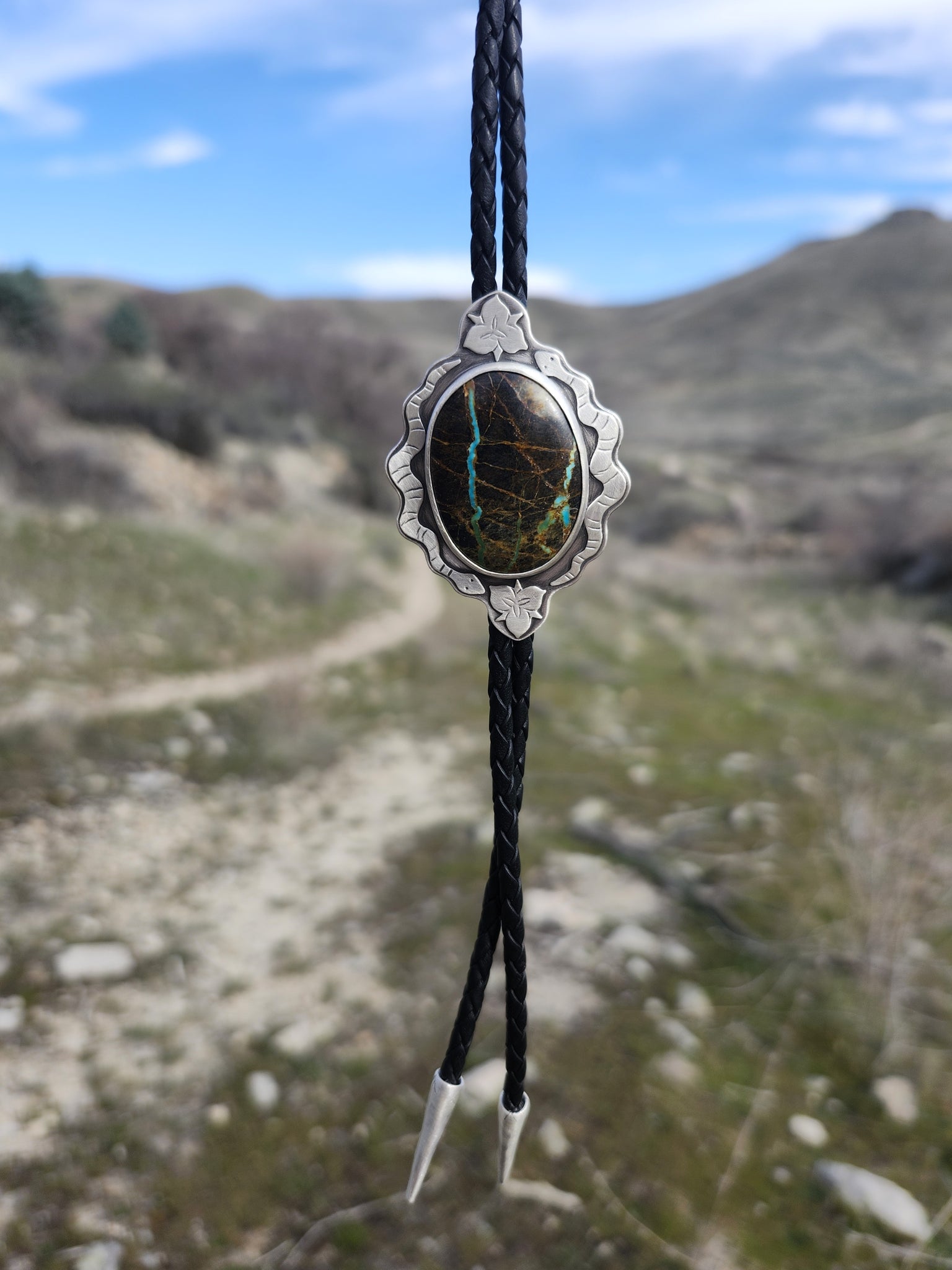 A mesmerizing dark stone with ribbons of vibrant turquoise running through it, is framed by two snakes, and sego lily flowers on the top and bottom. The bolo slides on a black braided leather cord with handmade silver tips. This statement piece and measures 2 inches long and about 1.5 inches wide, and the bolo cord measures 43 inches.